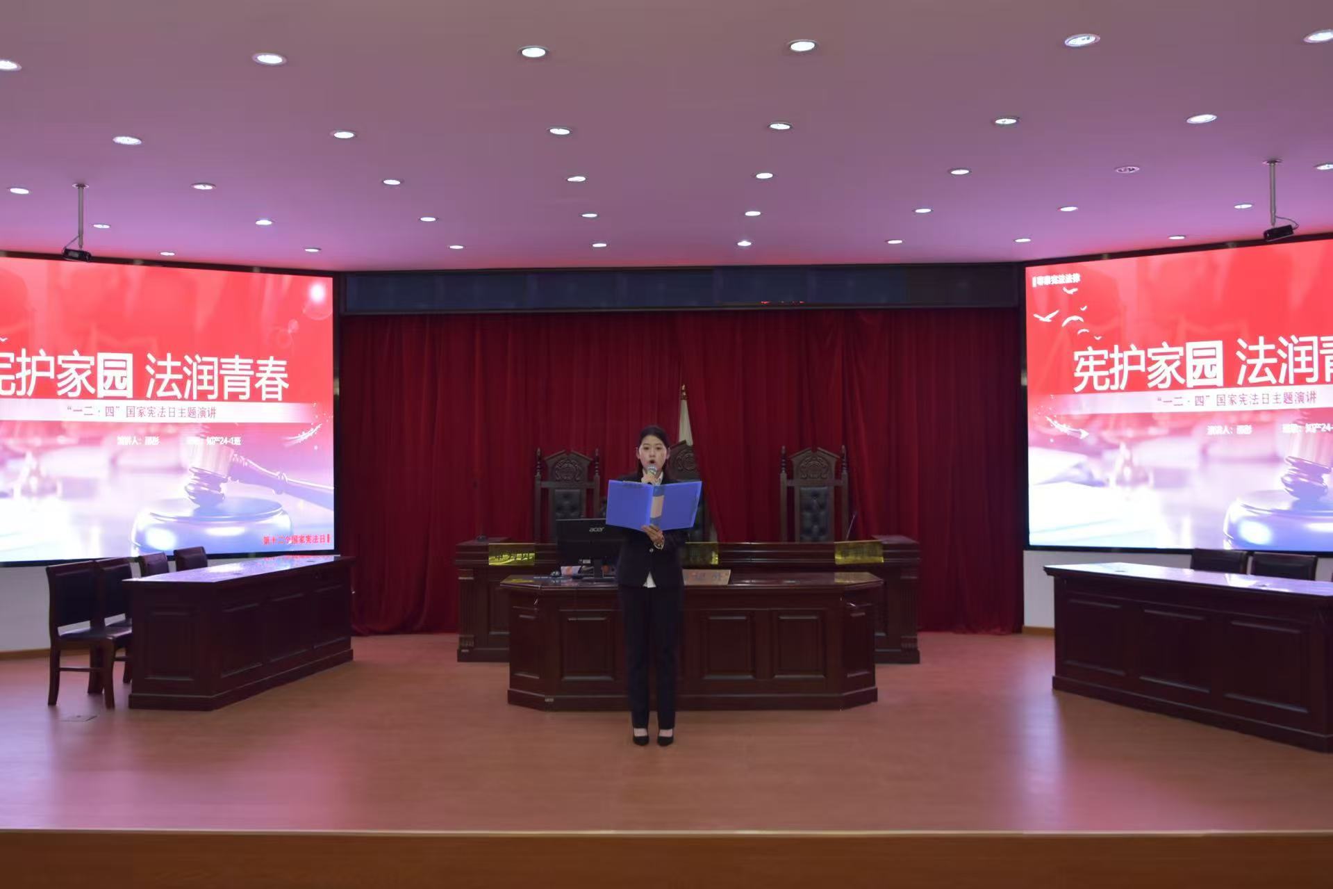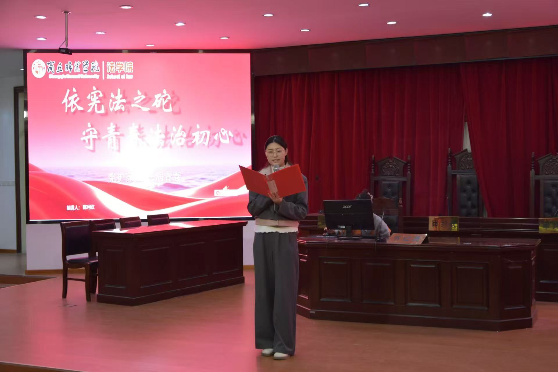 为深入学习宣传习近平法治思想,弘扬宪法精神,增强师生法治观念,12月1日,法学院在模拟法庭举行“宪护家园 法润青春”宪法主题演讲比赛,参赛选手们同台竞技,用铿锵有力的语言传递对宪法的敬畏与信仰。