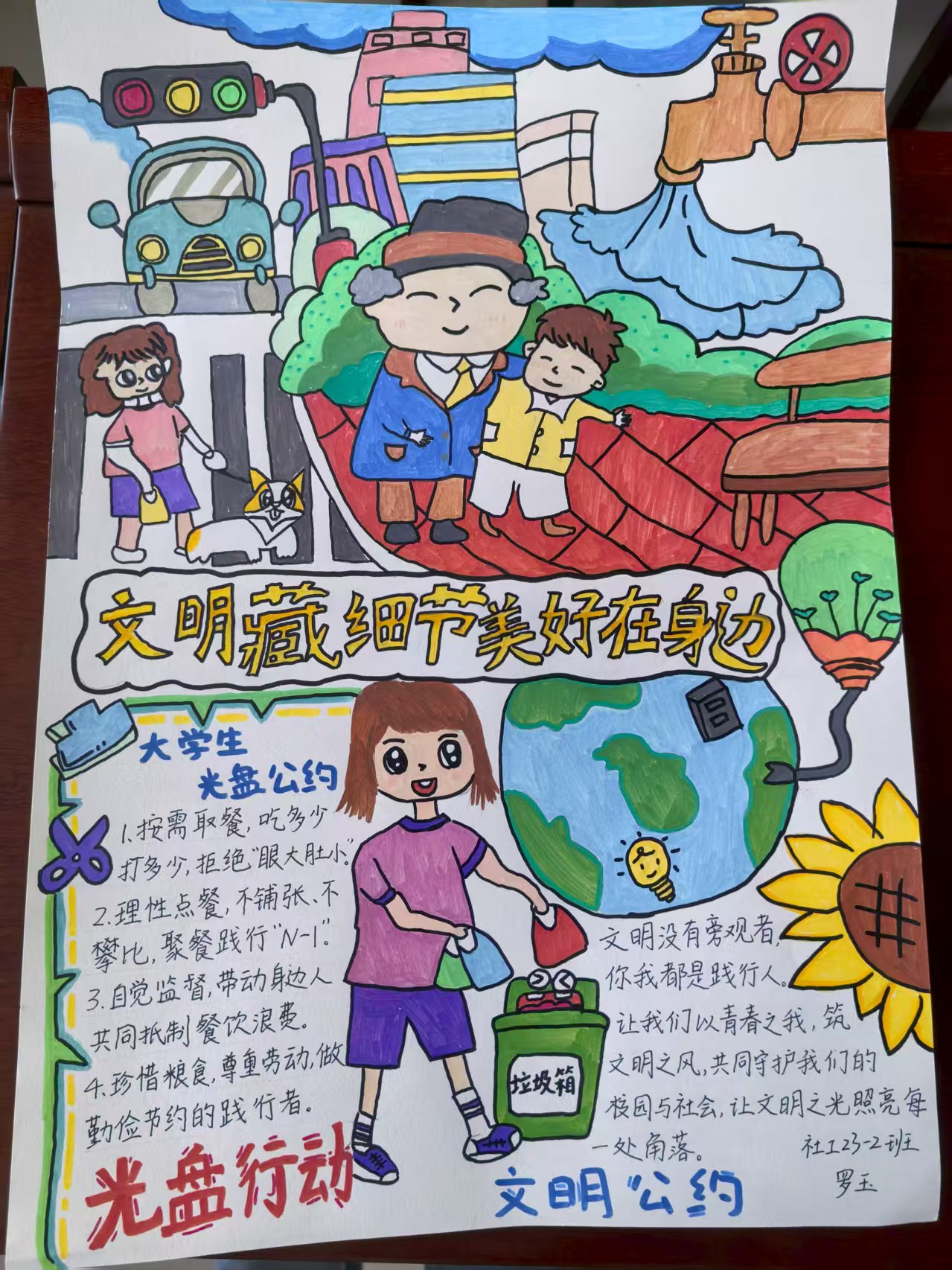 辅导员康昕表示,本次手抄报评选既是艺术展示平台,也是文明教育的生动课堂。同学们用创意传递文明理念,让礼仪之花绽满校园。此次活动的开展,进一步强化了校园文明建设,为安全文明卫生月增添了鲜活色彩,推动文明风尚持续深入人心。
