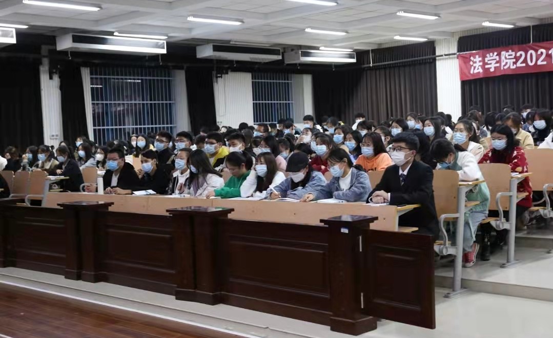 10月19日晚,法学院党委书记王庆在行方楼模拟法庭为2021级新生讲授大学第一堂党课。