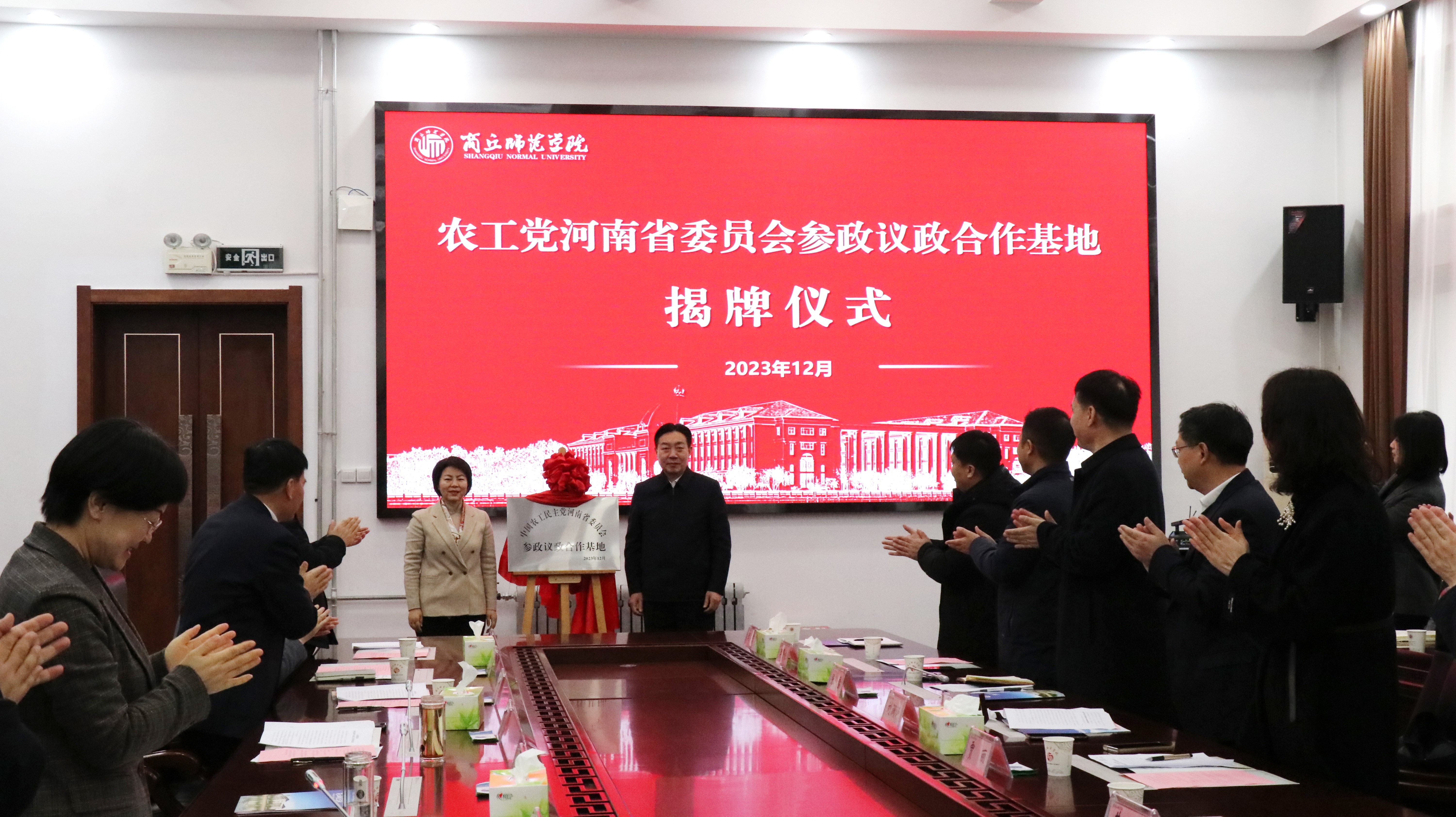 为更好地发挥民主党派基层组织的作用及高校人才智力优势,进一步加强参政党参政议政能力建设,12月29日上午,农工党河南省委员会参政议政合作基地揭牌仪式在我校归德楼320会议室隆重举行。第十四届全国政协委员、农工党中央委员会常委、河南省委会主委、省卫生健康委员会主任黄红霞,商丘市委副书记、统战部部长王玉娟,校党委书记张志坚、党委副书记吴金山出席揭牌仪式。仪式由商丘市委副书记、统战部部长王玉娟主持。