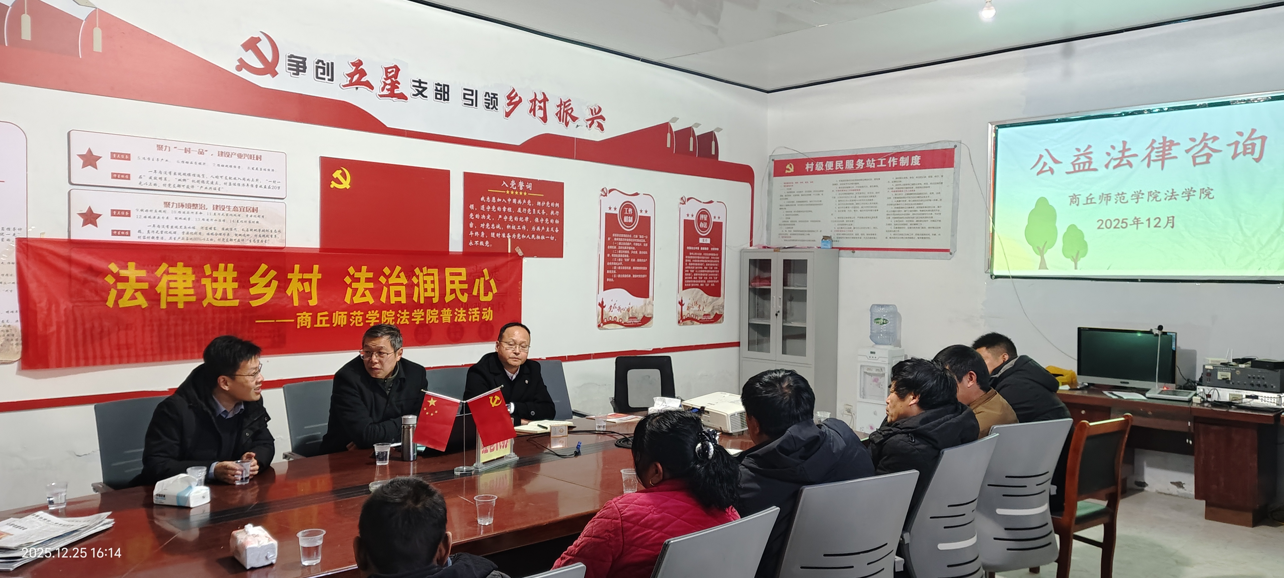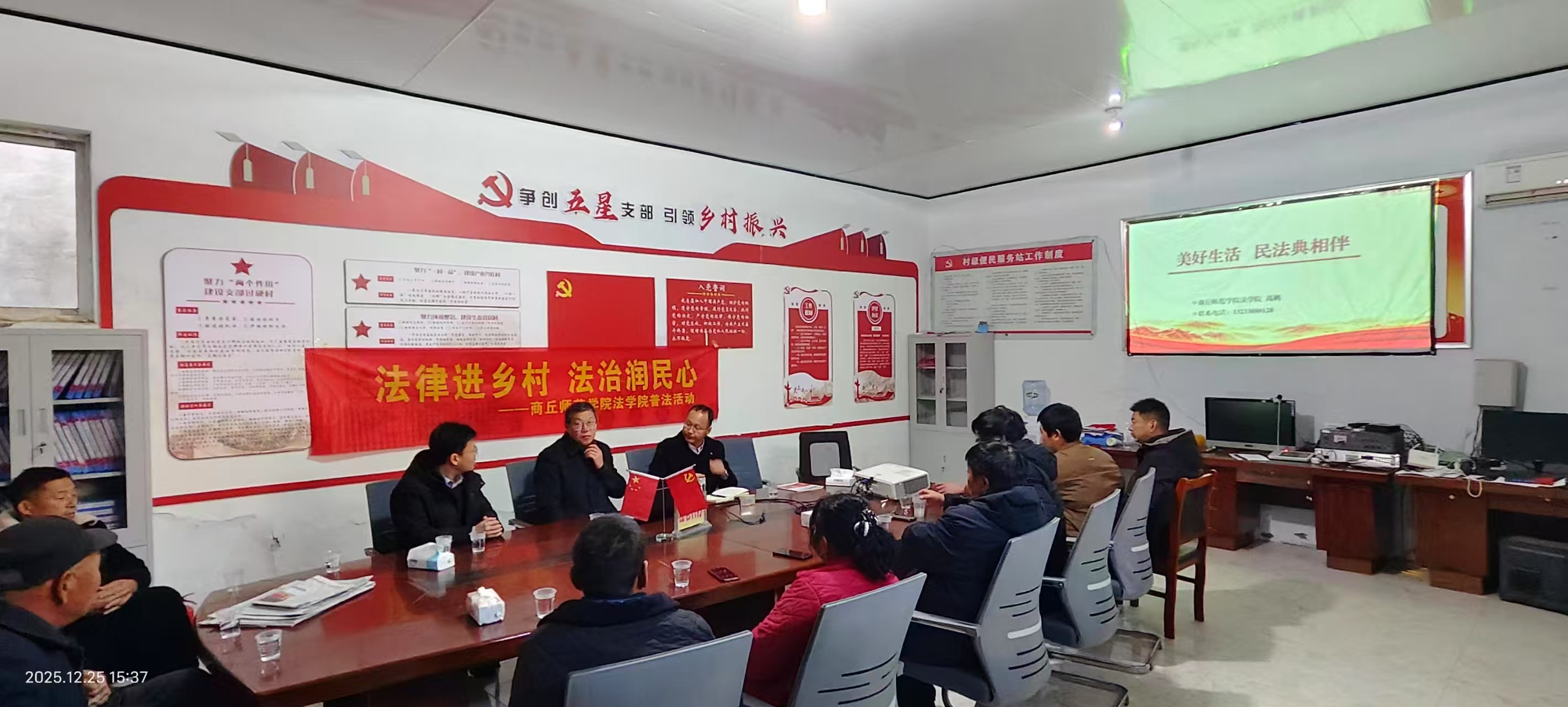 2025年12月25日,法学院教师杜亚、高鹏前往柘城县远襄乡司洼村,开展以“美好生活·民法典相伴”为主题的送法下乡惠民活动。该活动由司洼村驻村第一书记唐尧峥主持,村民委员会成员及村民代表参与。