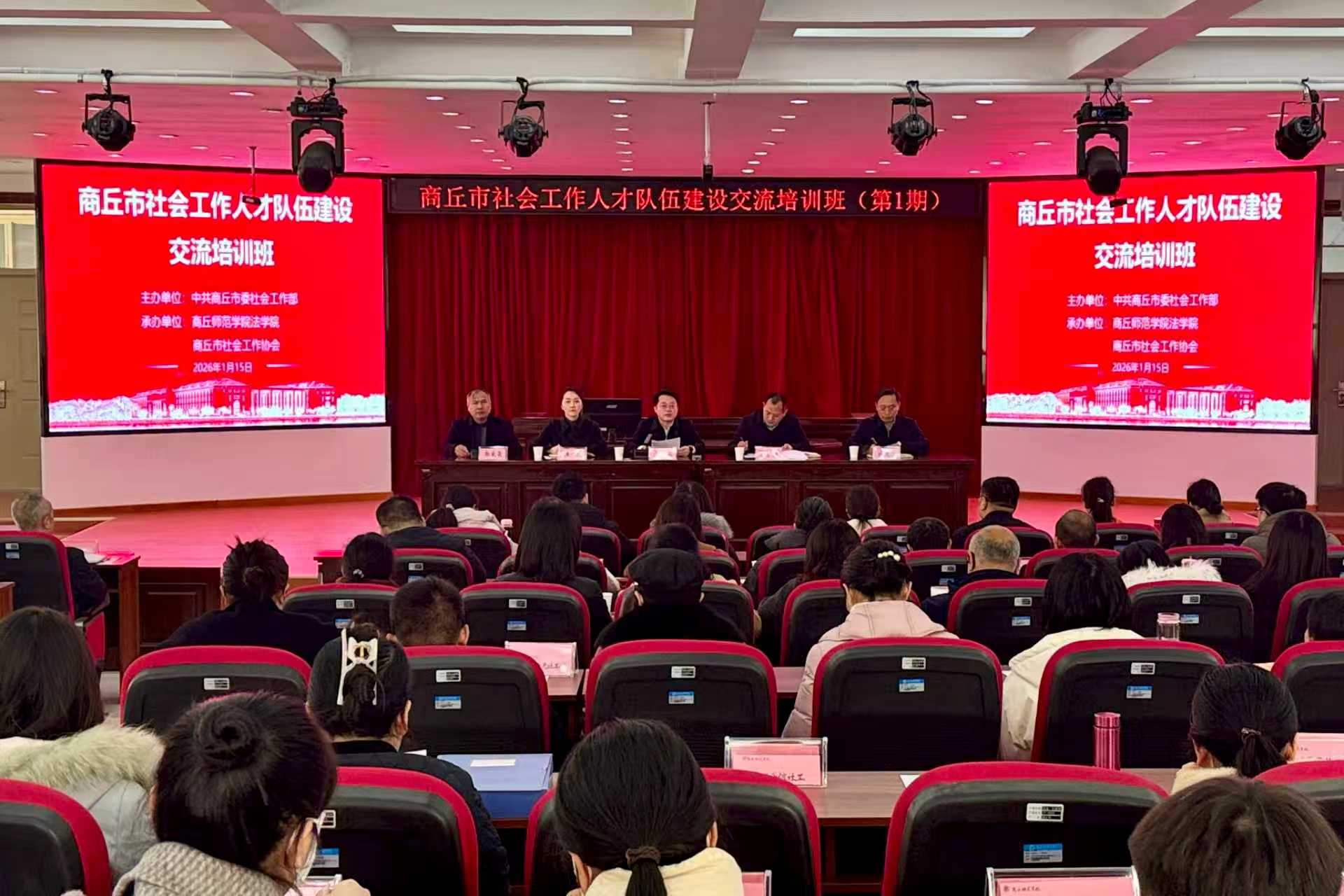 为进一步深化校地合作,服务商丘市社会工作人才队伍建设,1月15日上午,由中共商丘市委社会工作部主办,商丘师范学院法学院和商丘市社会工作协会承办的“全市社会工作人才队伍建设交流培训班”于我校行方楼模拟法庭顺利举办。商丘师范学院副校长翟滨、中共商丘市委社会工作部副部长曹思领,商丘师范学院法学院班子成员王庆、付先召出席开班仪式,商丘市社会工作协会副会长郭友亮主持开班仪式。