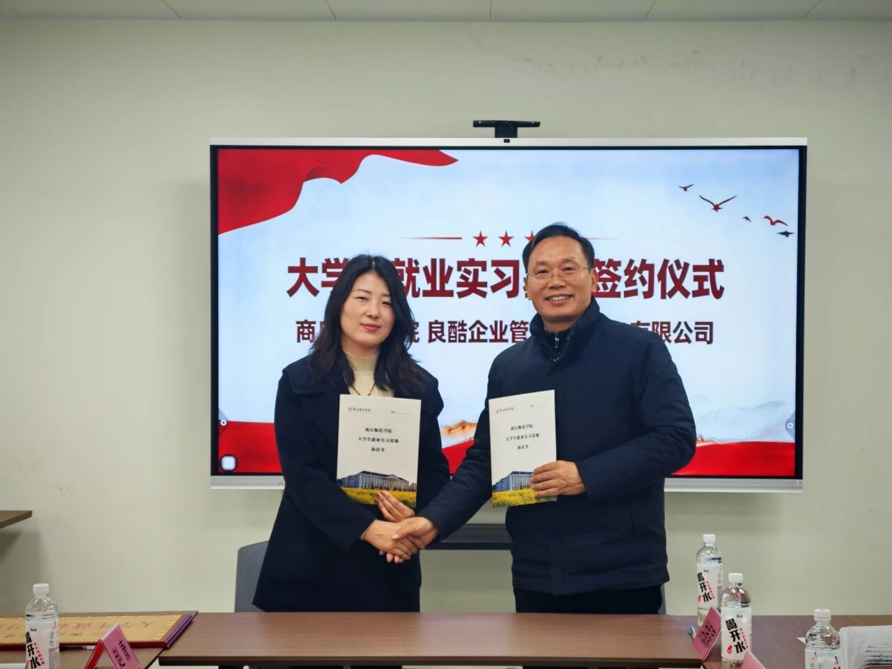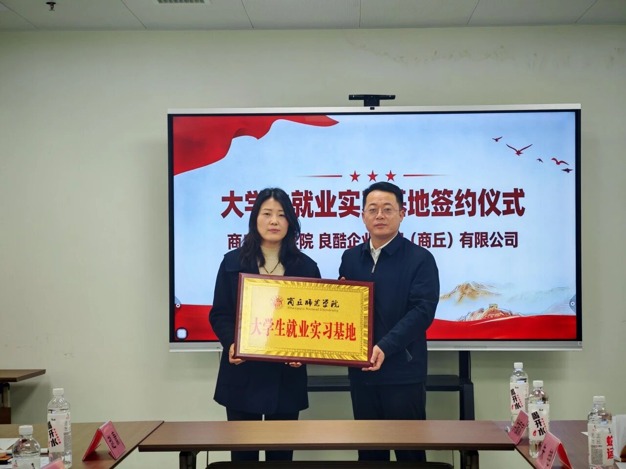 座谈会结束后,双方共同签署了《商丘师范学院大学生就业实习基地协议书》,并举行了“大学生就业实习基地”授牌仪式。